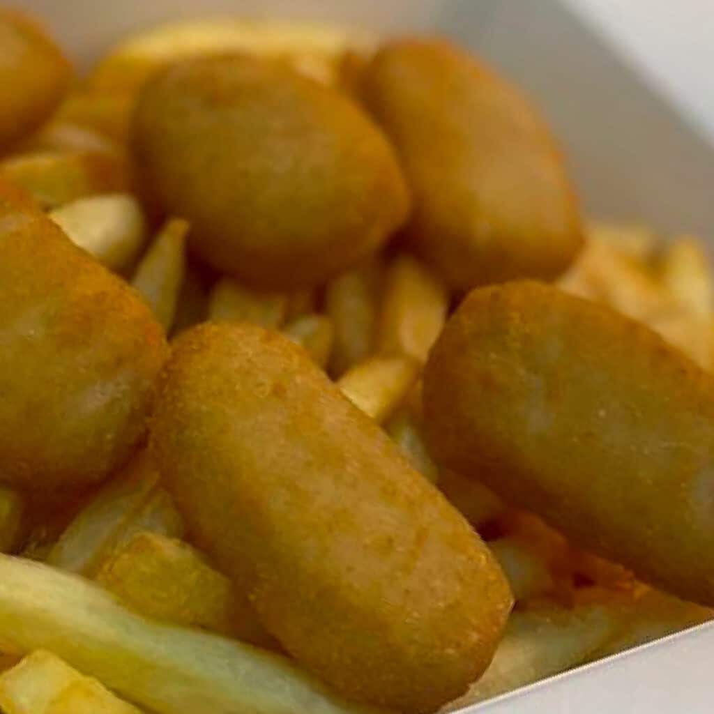 Tiras caseras de pechugas de pollo rebozadas, con patatas fritas y salsa a elegir.